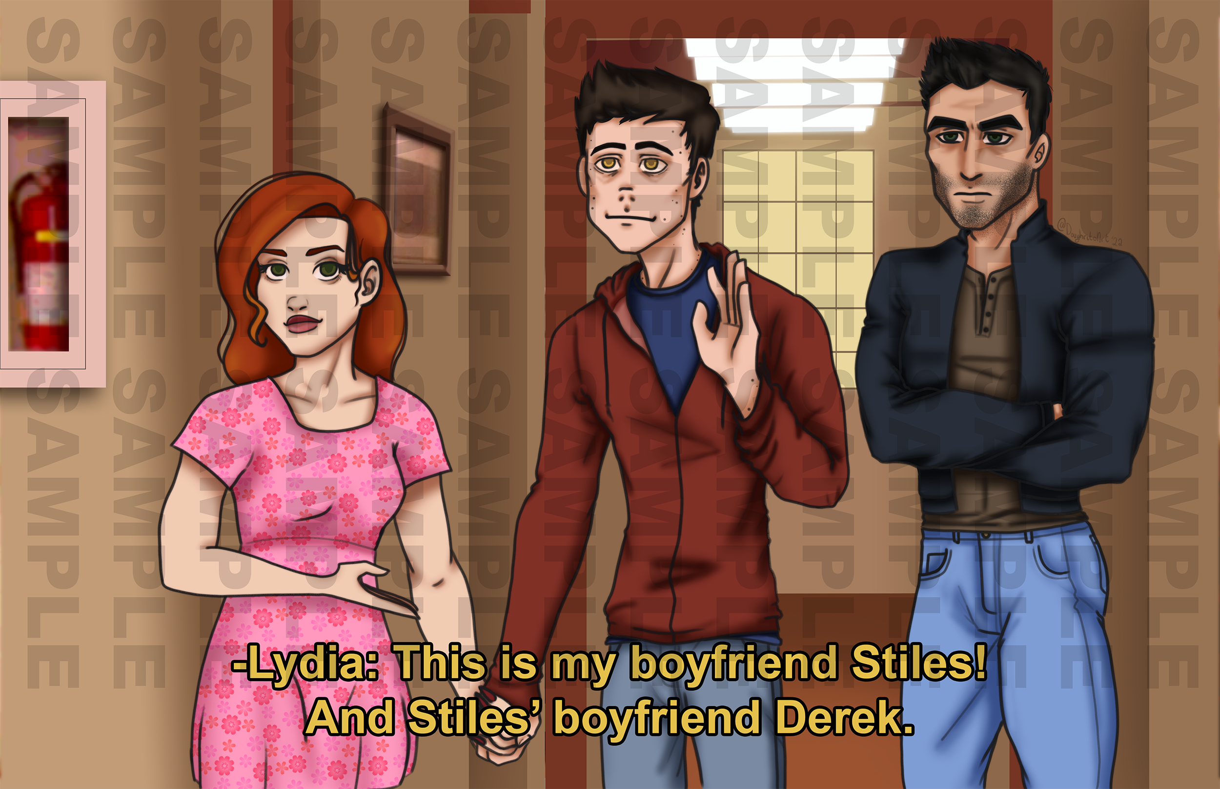 Image Description: Lydia is Introducing an off-screen friend to her boyfriend, Stiles, and then to Stiles' boyfriend, Derek. This is a Reference to the sitcom Parks and Rec, a popular meme to redraw.