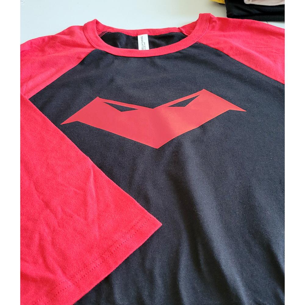 Red Hood logo professionally printed on Bella + Canvas 3/4 sleeve Baseball tee Standard American unisex sizing, S-XL